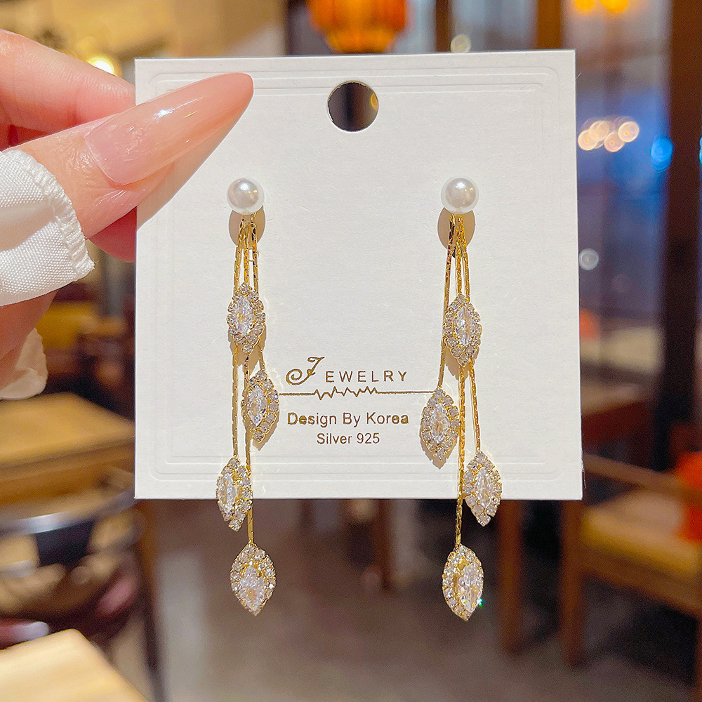 Designed Leaf Tassel Slimming Earrings, Accessible Luxury and High-End Internet Celebrity Earrings, Silver Needle Long Leaf Zircon Earrings