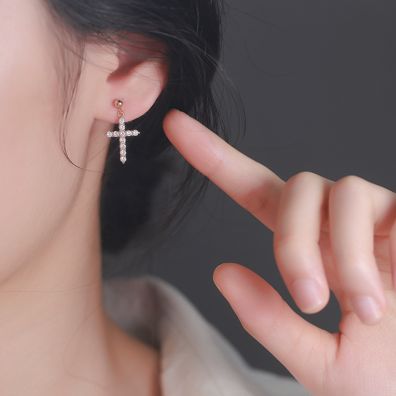 New S925 Silver French Baroque Cross Earrings Korean Internet Celebrity Elegant High-end Diamond Earrings Trendy