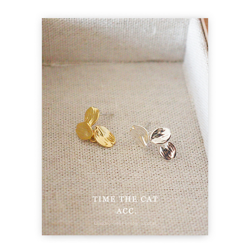 S925 silver needle French retro small leaf texture golden metal earrings niche design ins earrings for women