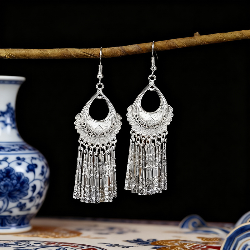Cross-Border Ethnic Style Silver Earrings, Retro Exaggerated Long Hollow Tassel Miao Silver Earrings, New Chinese Style National Style Earrings