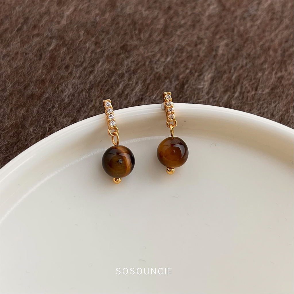 Autumn and Winter Popular Maillard Style Fashionable and High-End Tiger Eye Stone Micro-Paved Zircon Small and Simple Earrings Earrings Factory