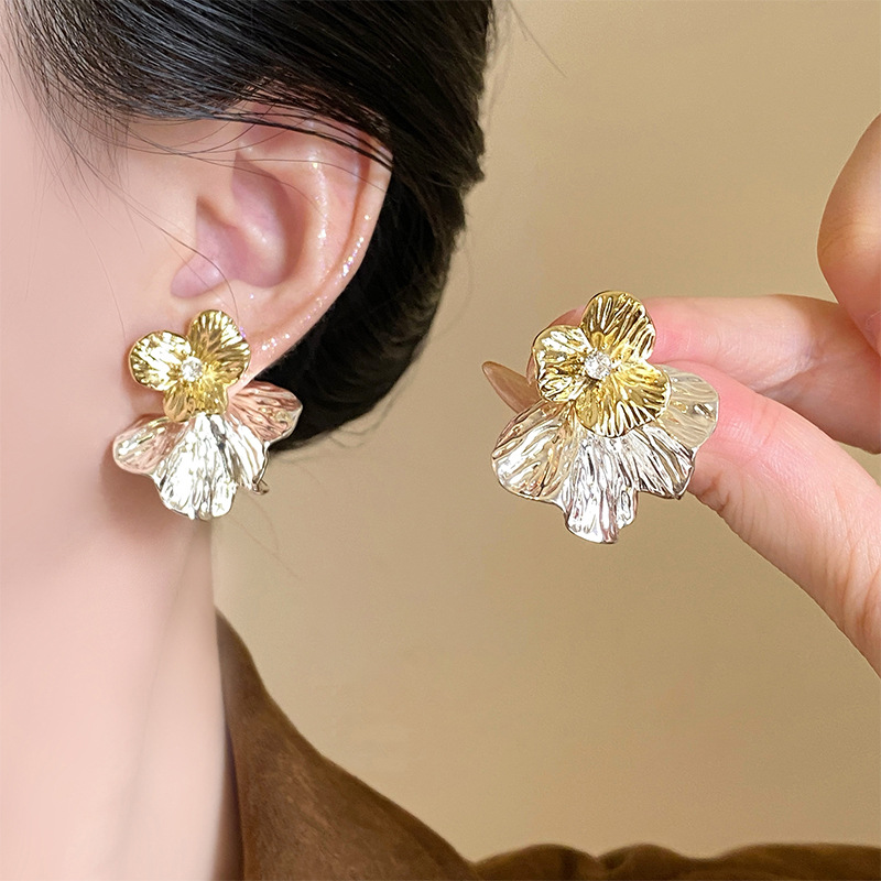 Retro Contrasting Color Pleated Flower Earrings for Women 2025 New Popular High-End Earrings Niche Metal Exaggerated Earrings