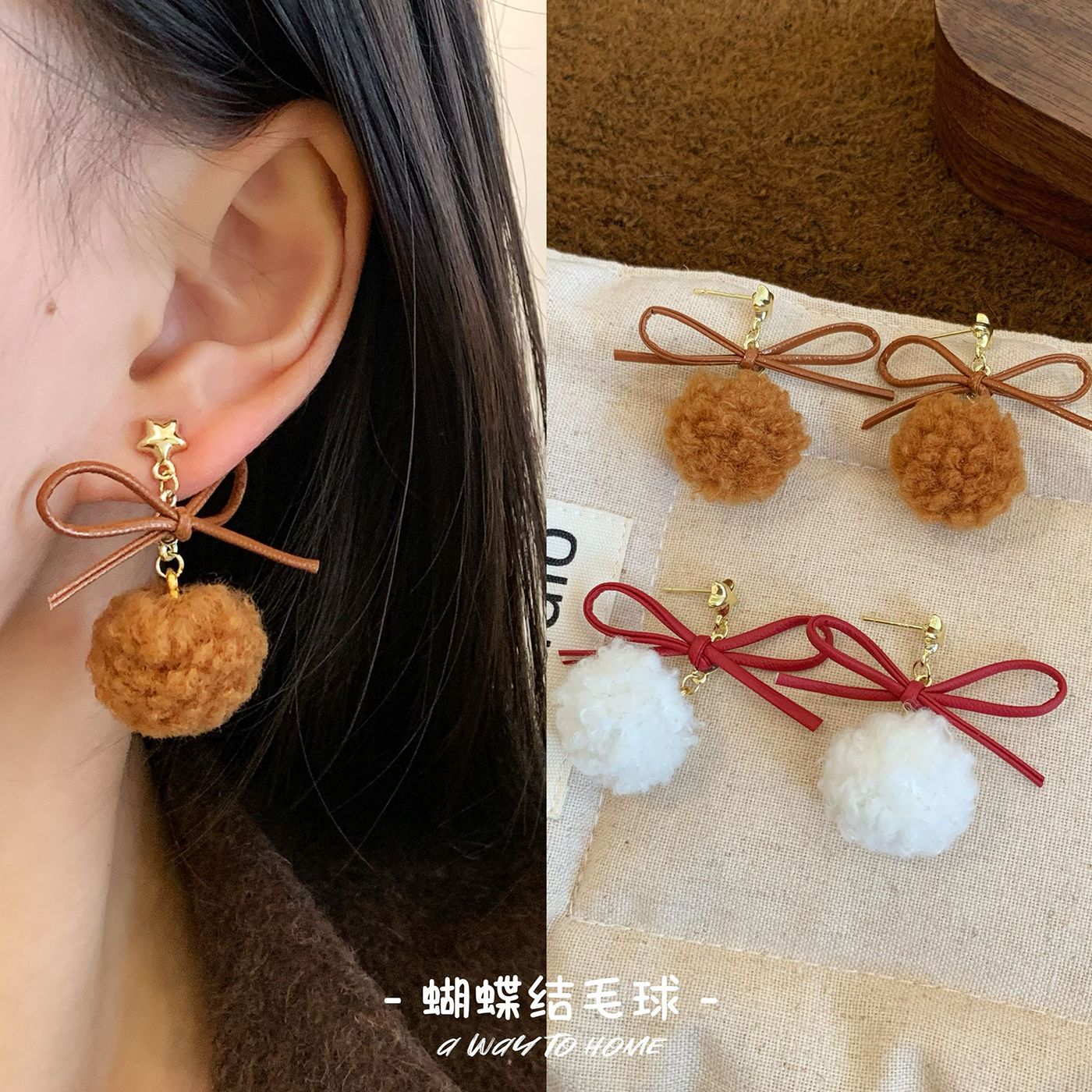 Autumn and Winter New Year Red-Brown Star Bow Fur Ball Earrings for Women with Silver Needles, Fashionable Design, Furry Earrings