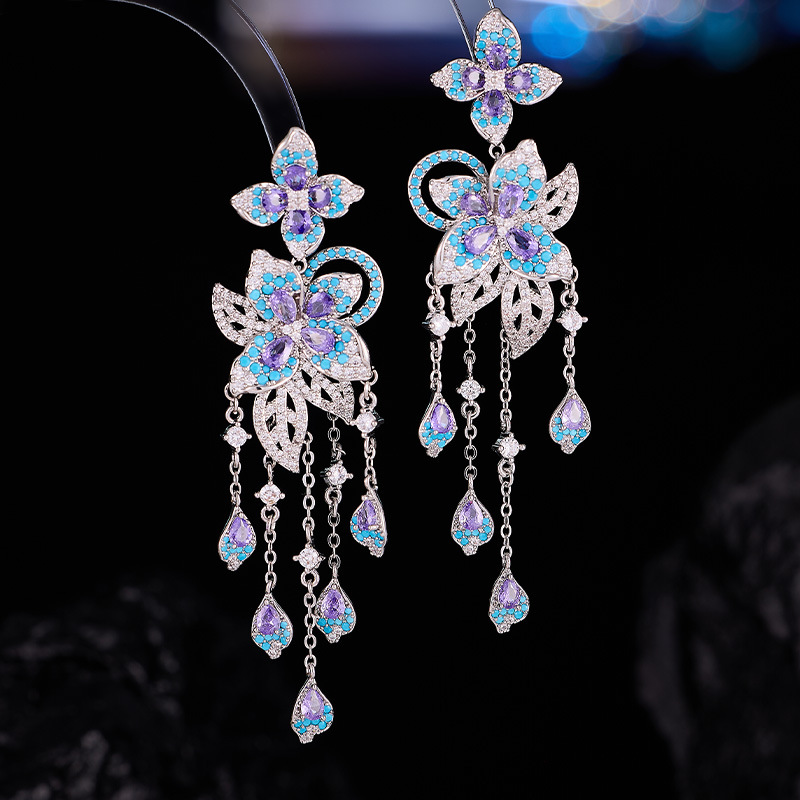 European and American Cross-Border Heavy-Duty Zircon Inlaid Light Luxury Floral Tassel Earrings with S925 Silver Needle, High-End Dress Evening Earrings