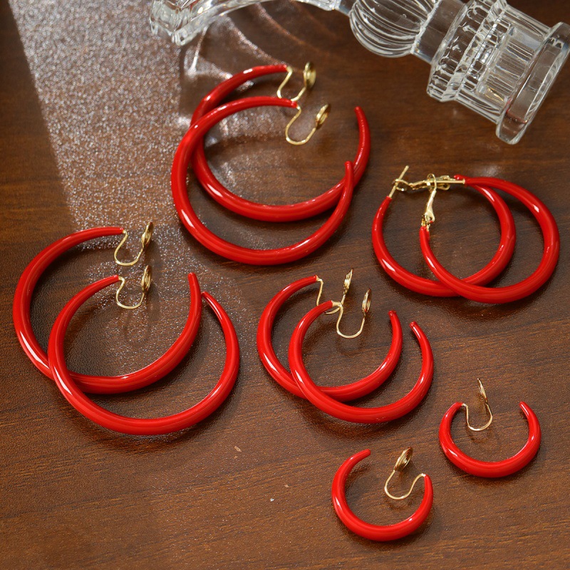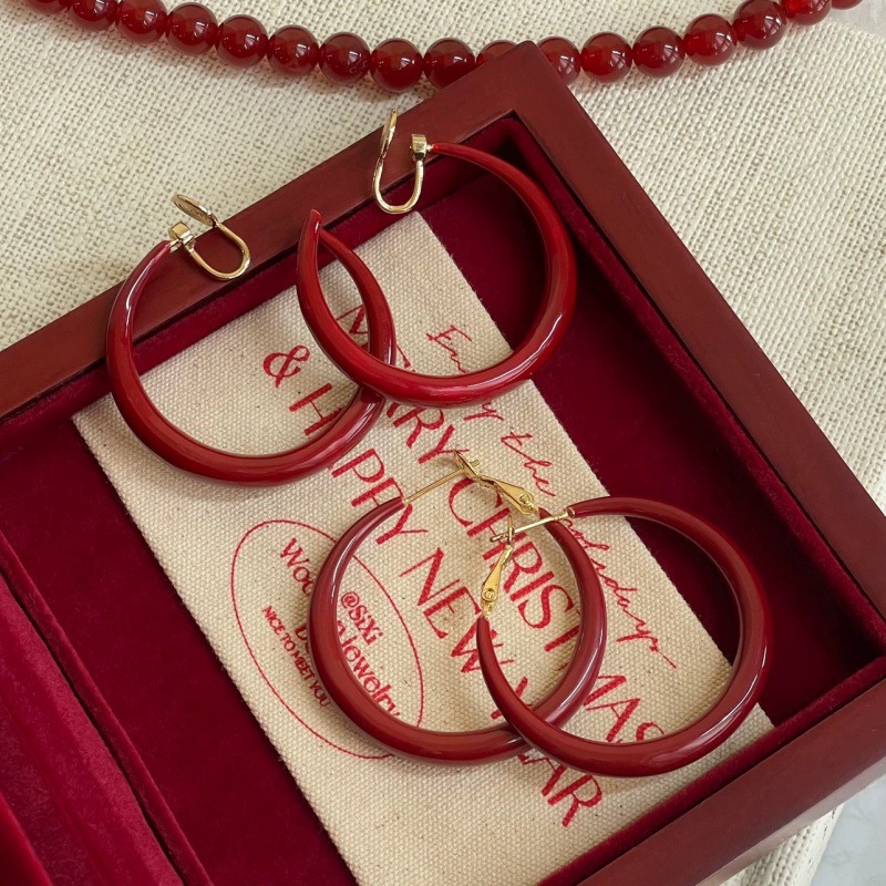Big Red Circle Glossy French Retro Hong Kong Style Exaggerated Red Earrings High-End Hoop Earrings Without Pierced Ear Clips for Women