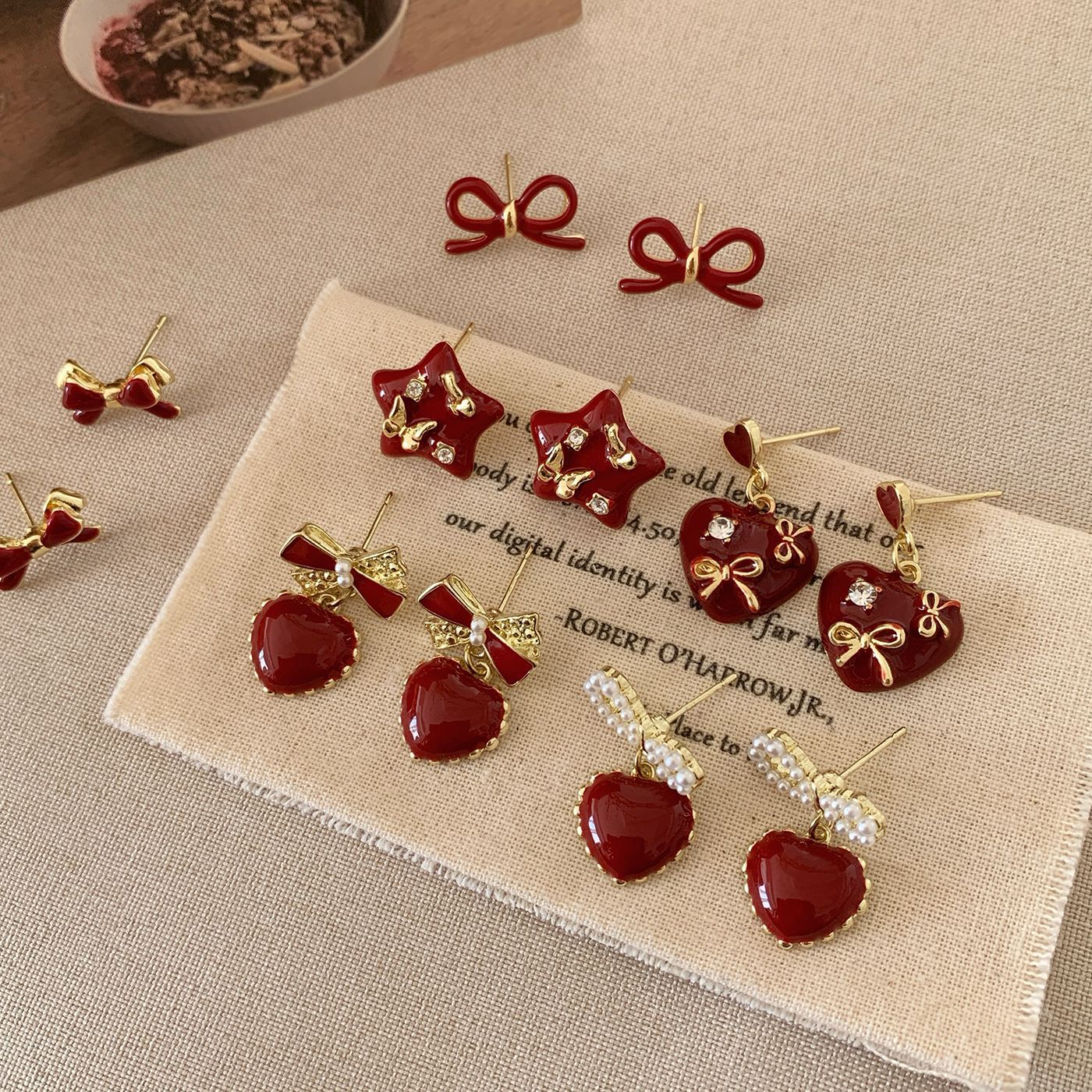 Autumn and Winter Ancora Red Heart-Shaped Earrings with Diamonds and Enamel, Silver Needle, Niche Exquisite Design, Festive Earrings for Women