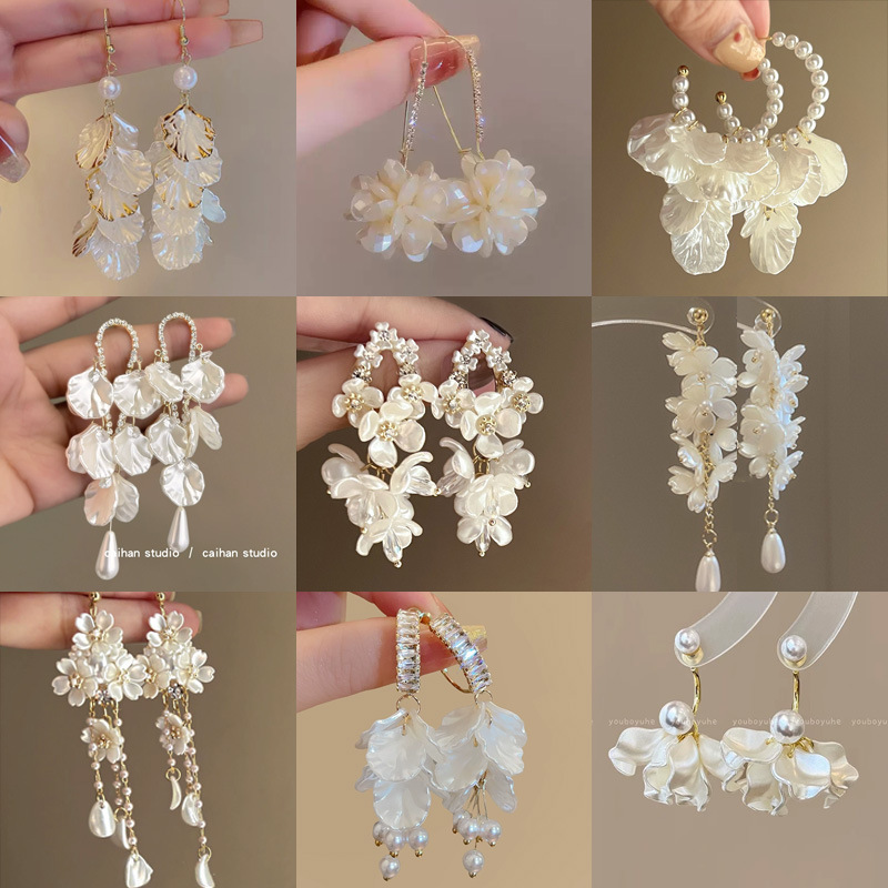 Silver Needle Inlaid Diamond Pearl Petal Tassel Earrings Fashionable Versatile High-End Earrings Niche Commuter Earrings Wholesale Women