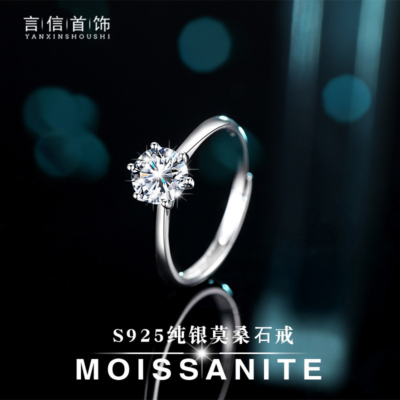 S925 Sterling Silver D Color Moissanite Simulated Diamond Ring Classic Six-Claw One Carat Open Female Live Broadcast with Certificate