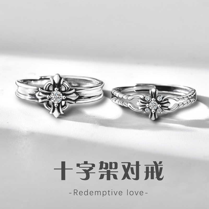 Retro S925 Sterling Silver Cross Couple Rings, Old High-End Men's and Women's Rings, Cross-Border Popular Jewelry