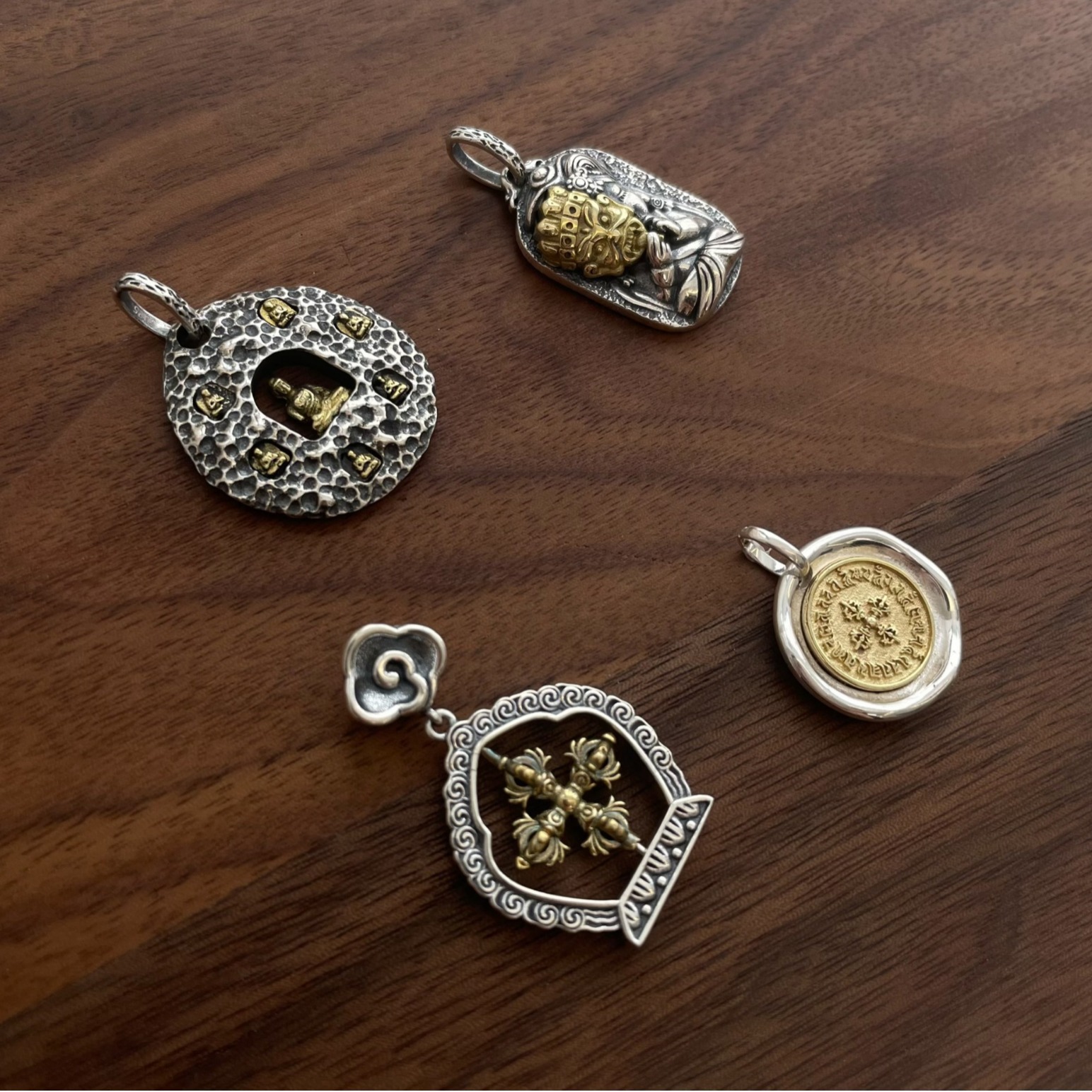 s925 sterling silver National style men's and women's heavy industry pendant rotating cross Diamond pestle Buddha pendant double-sided tag