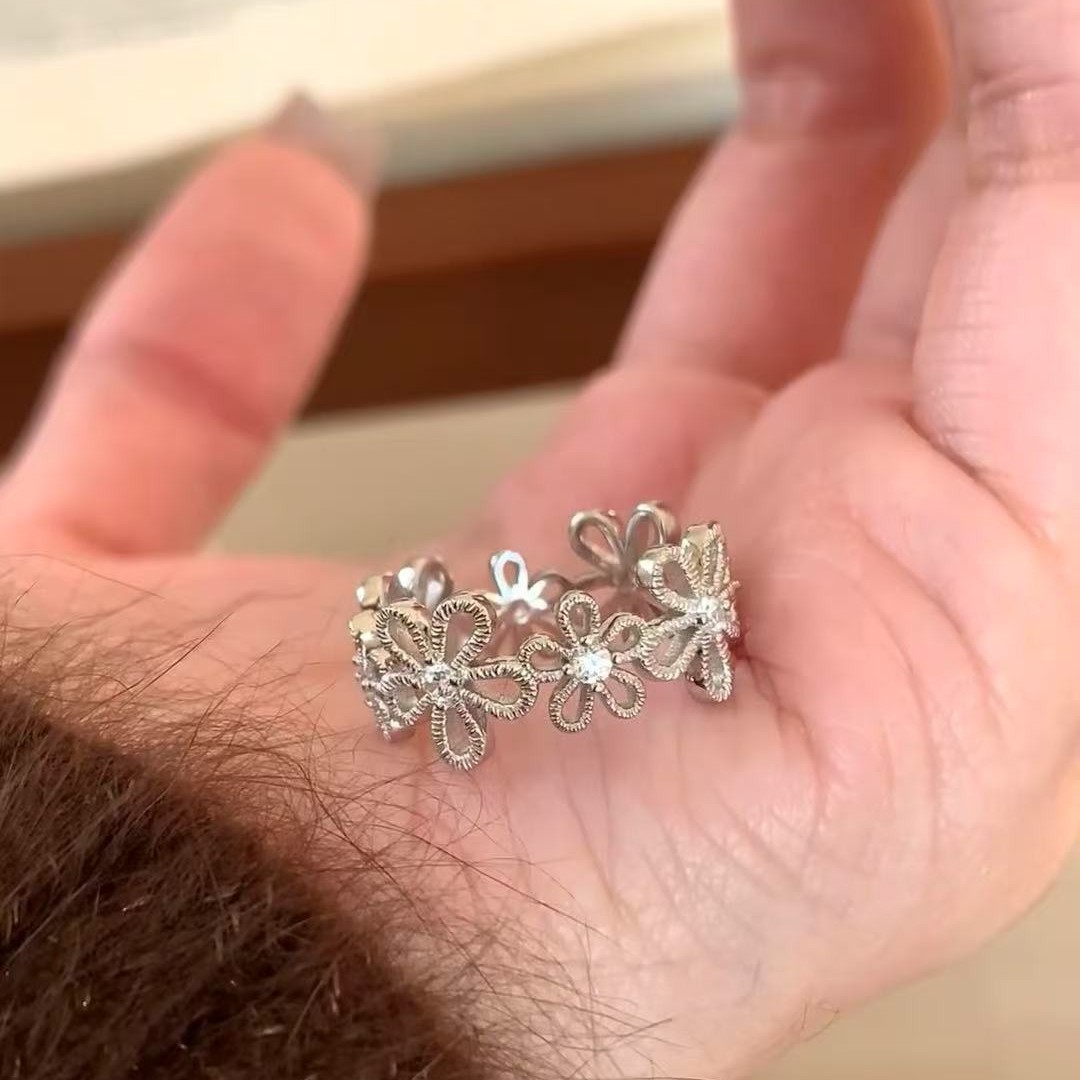 Carets Korean K-Style S925 Sterling Silver Retro Old Pearl Flower Stylish Elegant Thai Silver Open Ring Ring