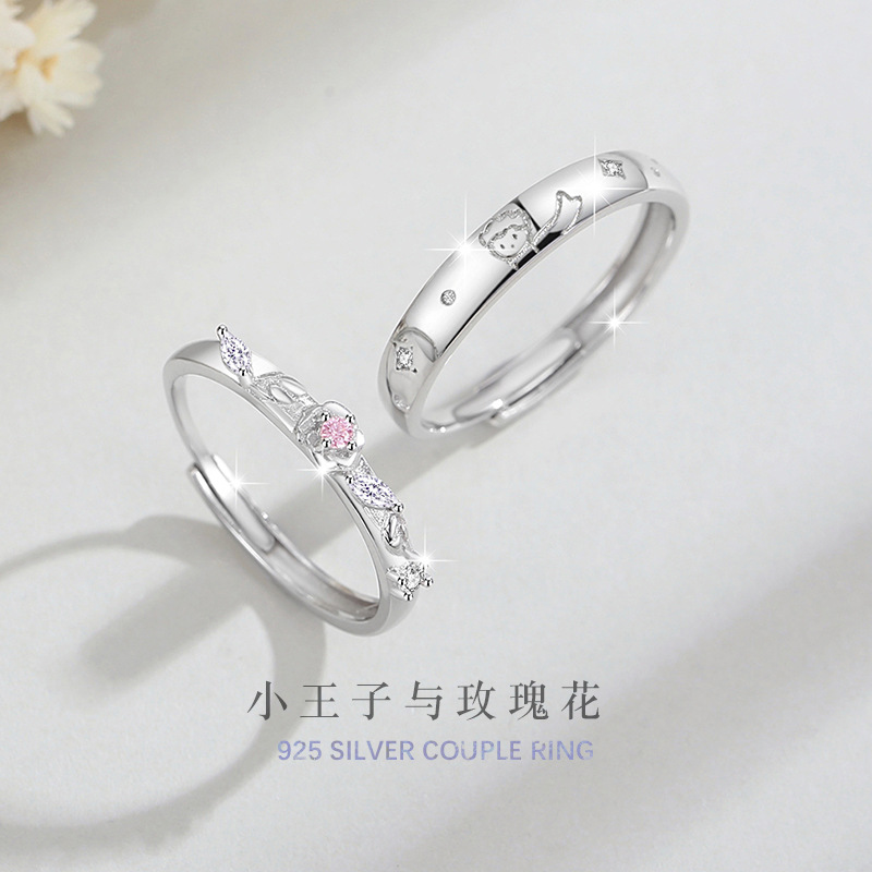 Little Prince and Rose Sterling Silver 925 Couple's Ring Men's and Women's Fashion Joker Pink Diamond Ring Star Ring