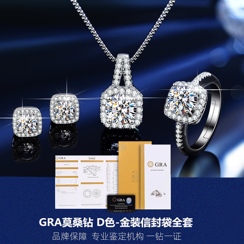 Hot Selling Douyin Kuaishou Internet Celebrity Live S925 Sterling Silver Moissanite Square Pack Three-Piece Set Ring Earrings Necklace for Women