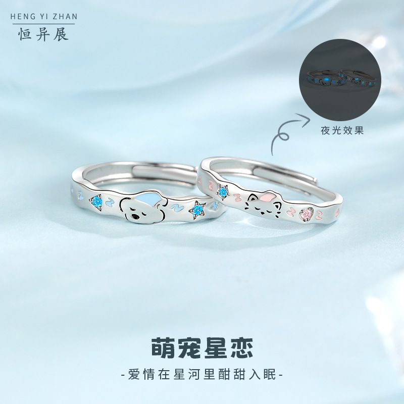 Original Design Luminous Cat and Dog Diary Ring Sterling Silver 999 Korean Version Cute Pet Kitten and Puppy Couple Ring
