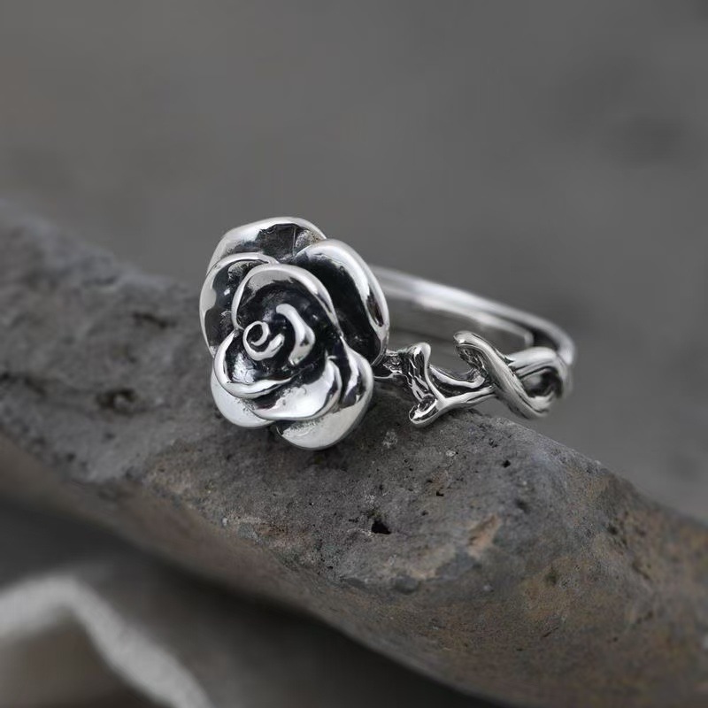 Silver Old Retro Thai Silver Craft Ring Wholesale Opening Adjustable Women's Cross-Border Jewelry Rose Ring
