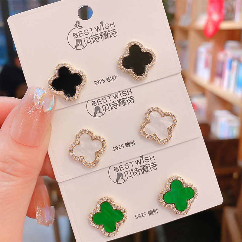 Super Exquisite 925 Silver Needle Black Four-leaf Flower Earrings Women's Trendy Elegant Internet Celebrity Small and Exquisite Earrings Earrings