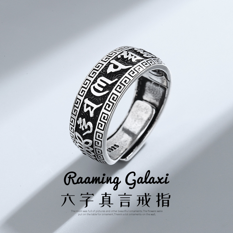 Six-character mantra men's ring trendy domineering wide open ring retro old anti-Thai silver Xizang motto ring