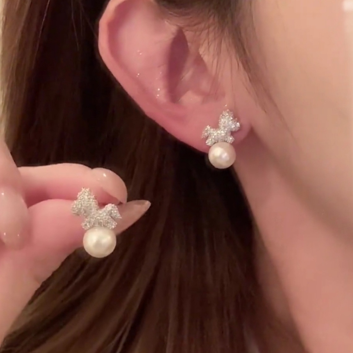 Silver Micro-Paved Pony Pearl Earrings for Women, Japanese and Korean Sweet Small Earrings, 2025 New Year's New Style