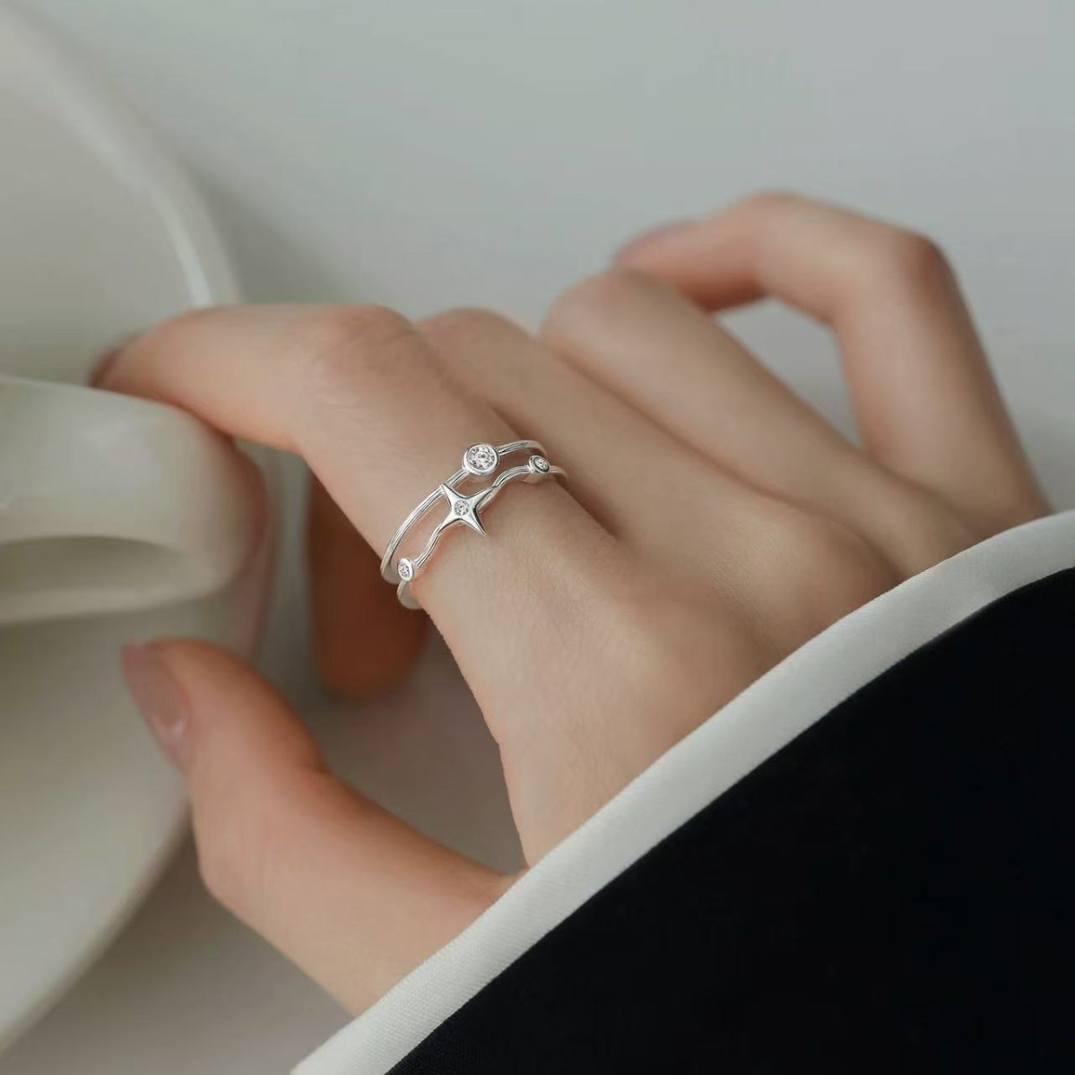 925 Silver-Plated Four-Pointed Star Ring, Accessible Luxury Niche, High-End Open Ring, Women's Index Finger Ring, Plain Ring