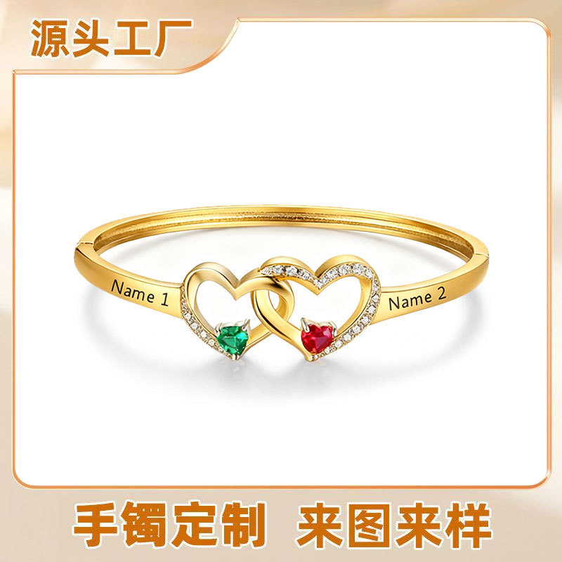 Cross-Border Hot-Selling Valentine's Day Double-Heart Birthstone Bracelet with Custom Engraving and Stitching Bracelet Inlaid with Zircon Girls' Accessories