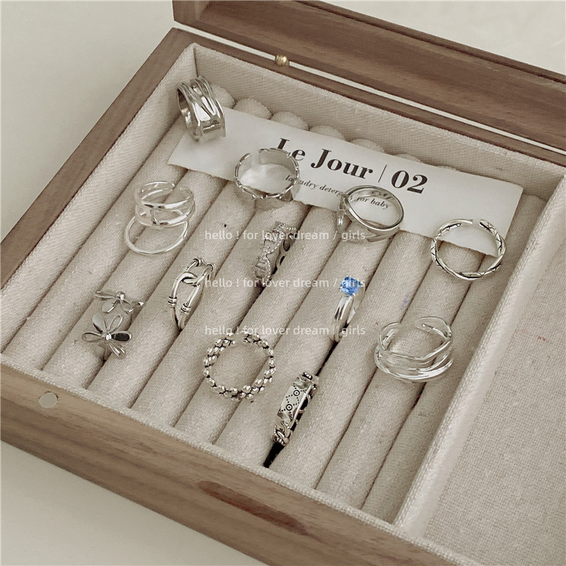 Korea New Retro Geometry Antique Silver Ring Sweet Cool Girl Style Flower Rhinestone Size Ring Hand Jewelry