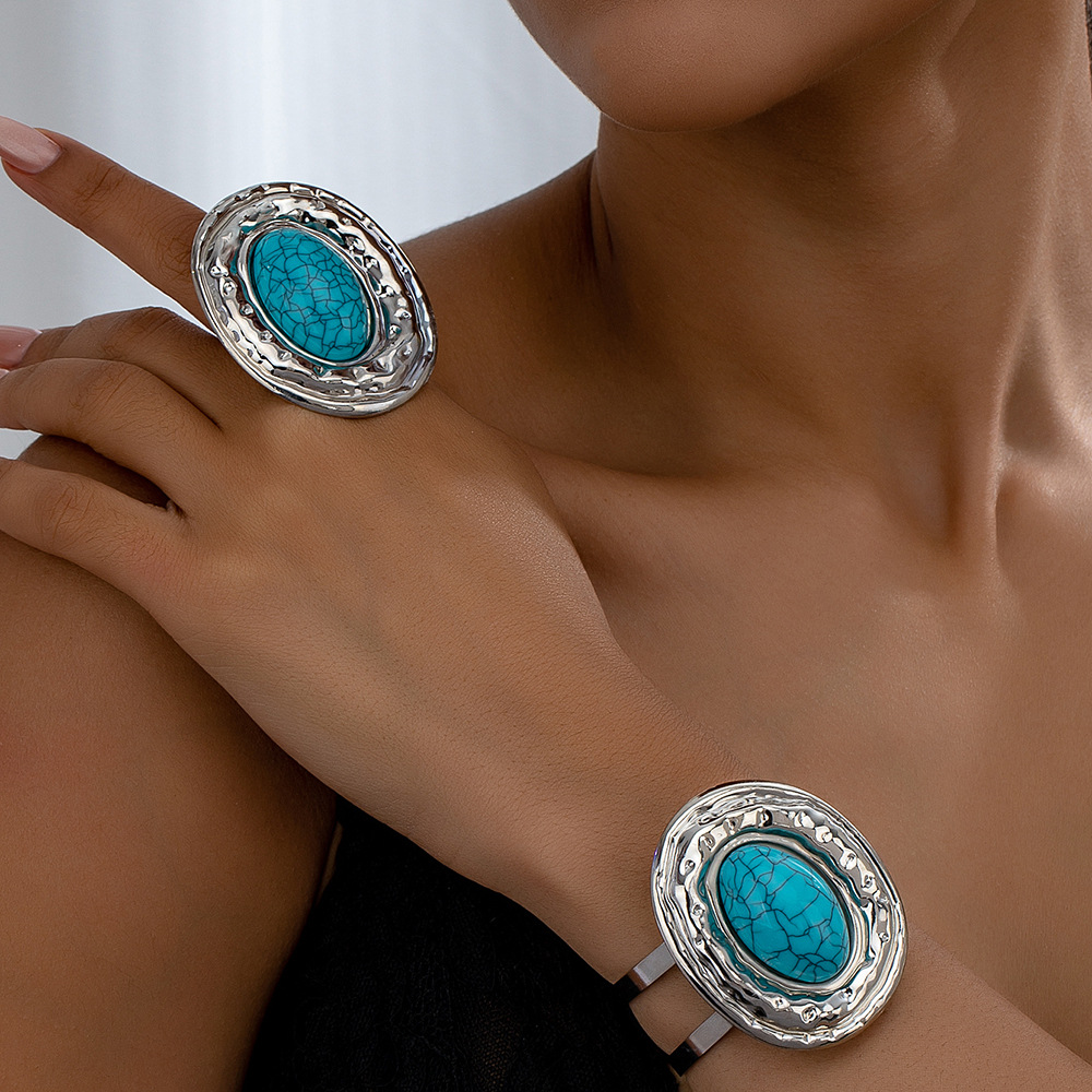 Europe and the United States cross-border inlaid blue turquoise best selling bracelet ring suit simple daily commuter party with trendy jewelry