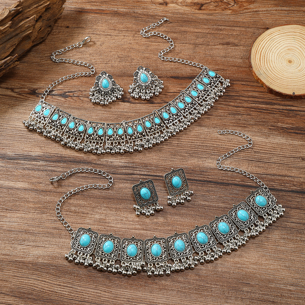 Cross-border Middle East Retro Ethnic Turquoise Exaggerated Chain suit Heavy Industry Tassel Alloy Earrings Necklace Jewelry