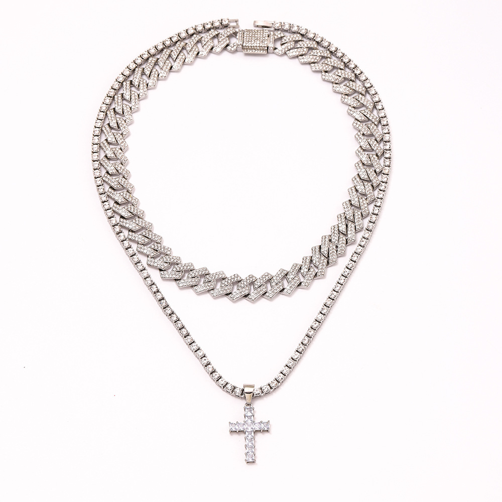 Cross-border Hot Diamond Cross Pendant Alloy Cuban Chain Single Row Chain suit Accessories Joker Hip-hop Necklace
