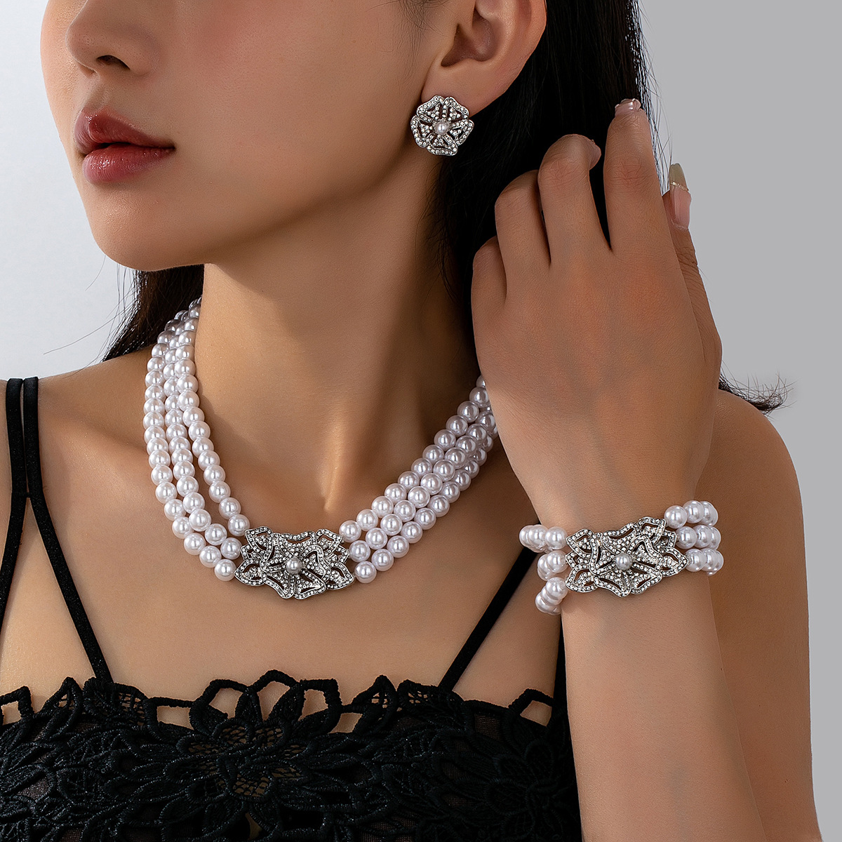 Cross-Border Xiyin Popular Style Silver Multi-Layered Pearl-Encrusted Diamond Sparkling Necklace Bracelet Earrings Set Accessories for Women