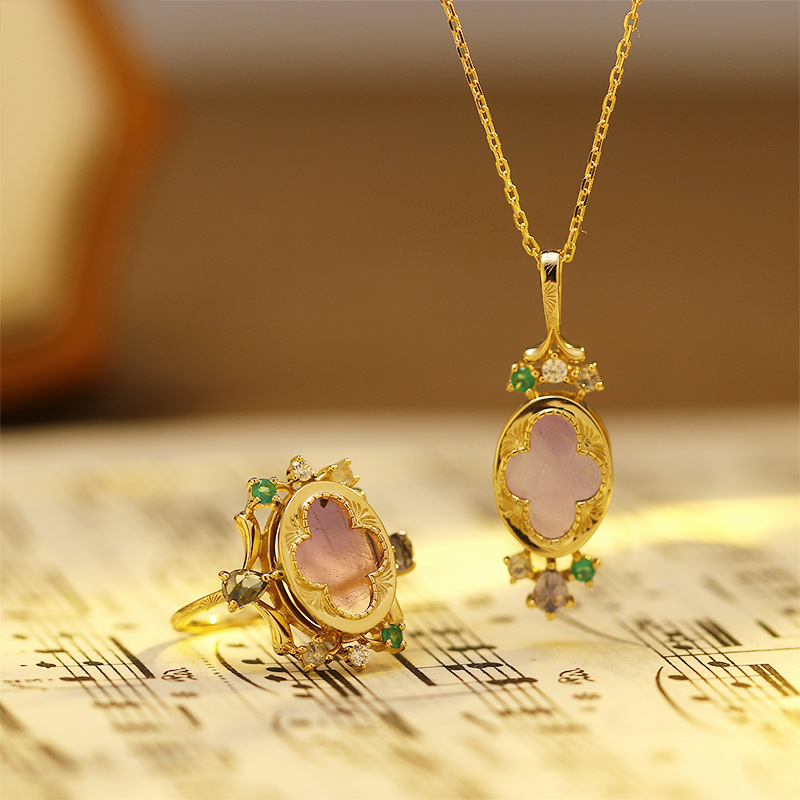 Dunli Jewelry Amethyst Flower Oval S925 Silver Ring Pendant Set Winter Personalized Retro Jewelry