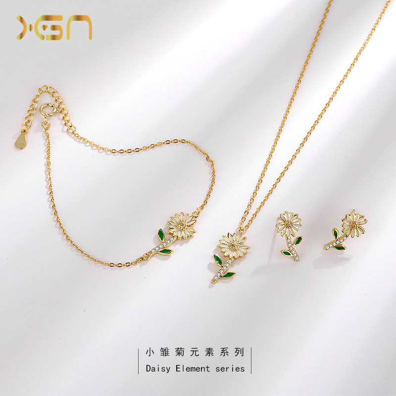 s925 Sterling Silver Daisy Necklace Women's ins Simple Niche Light Luxury High-end Sense Chrysanthemum Stud Earrings Bracelet Set