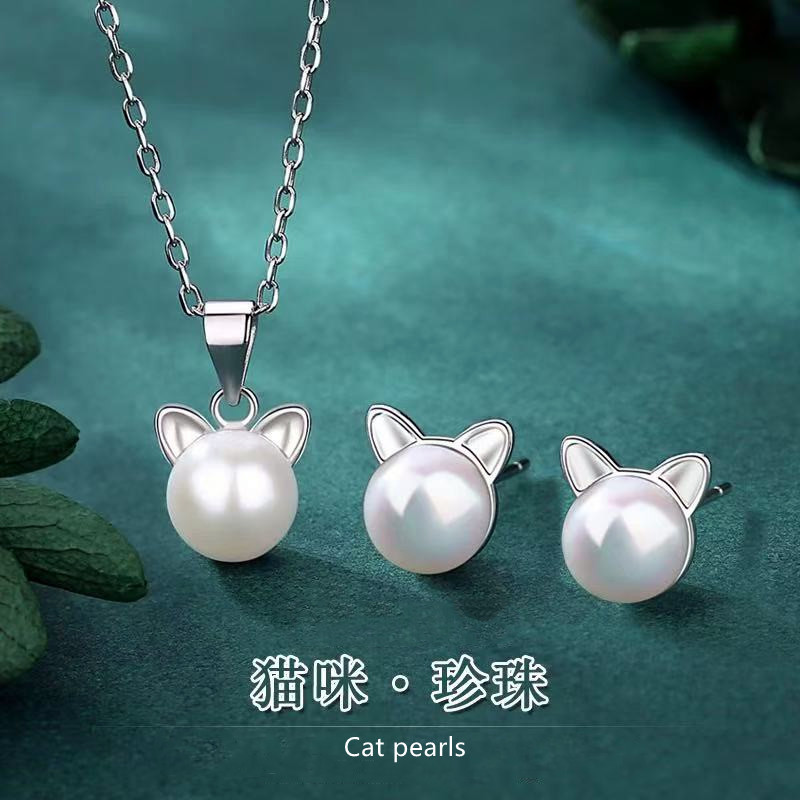 Cross-Border New Cat Freshwater Pearl Set for Women S925 Sterling Silver Niche Accessible Luxury Cute Cat Ear Necklace Earrings