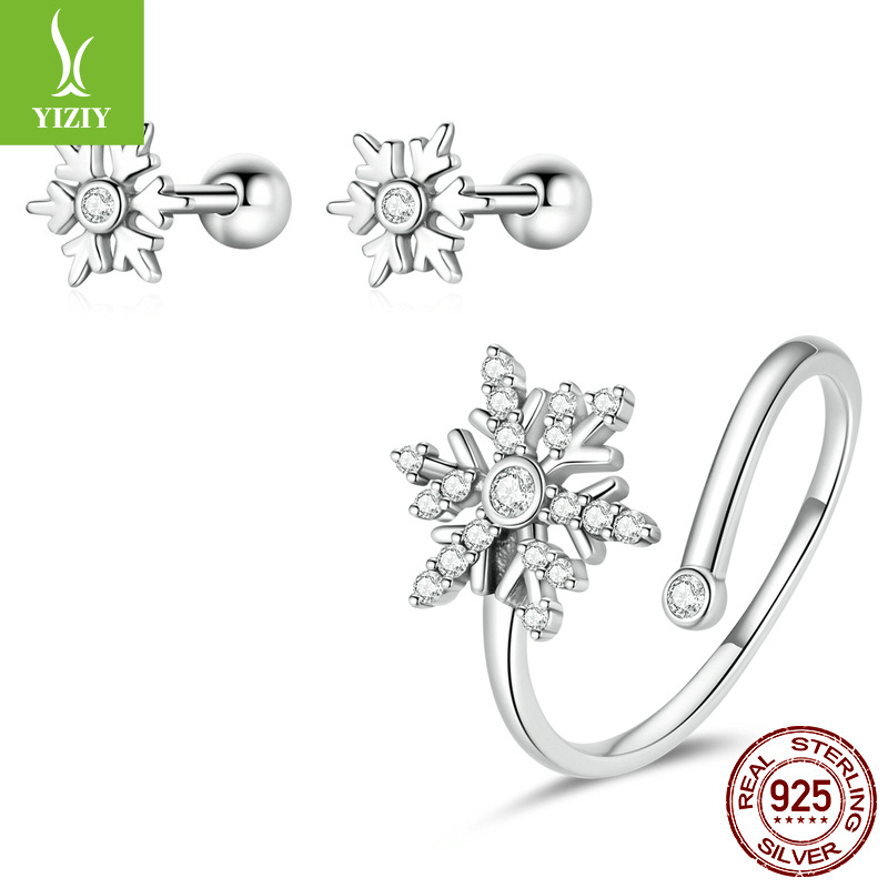 Yinziyun Hot Selling Christmas Snowflake Earrings Ring Jewelry Set Winter Beautiful Snowflake S925 Silver Earrings