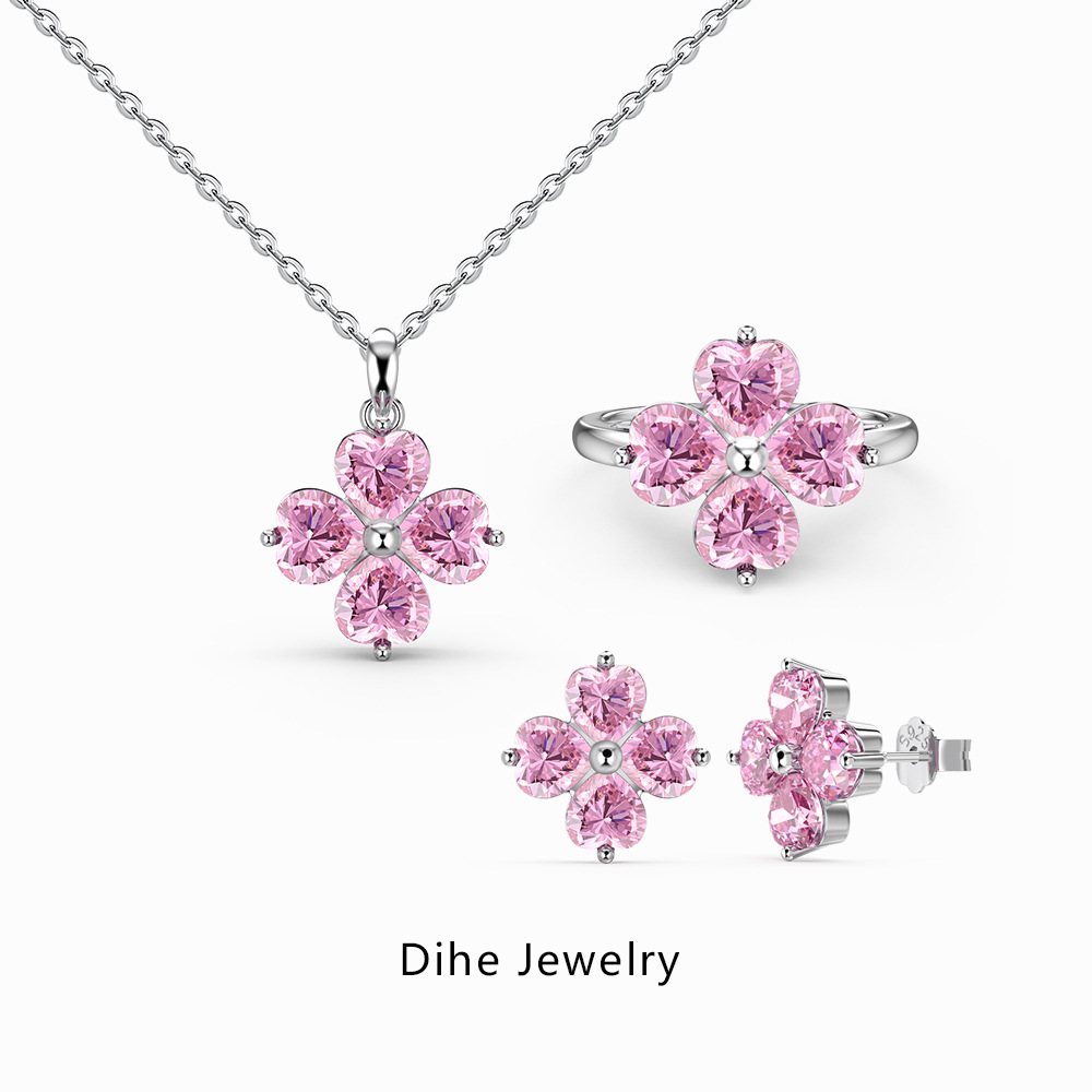 Japanese and Korean-style light luxury new S925 sterling silver necklace ring stud earrings female peach blossom lovely pink diamond green diamond female suit in stock