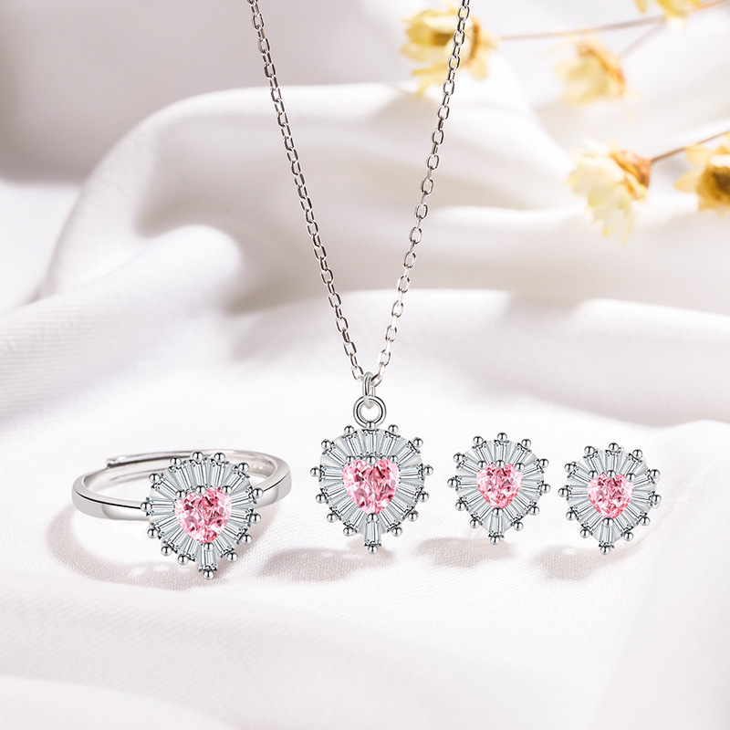 Caraini s925 sterling silver pink diamond heart-shaped suit heart-shaped pendant necklace ring stud earrings three-piece set
