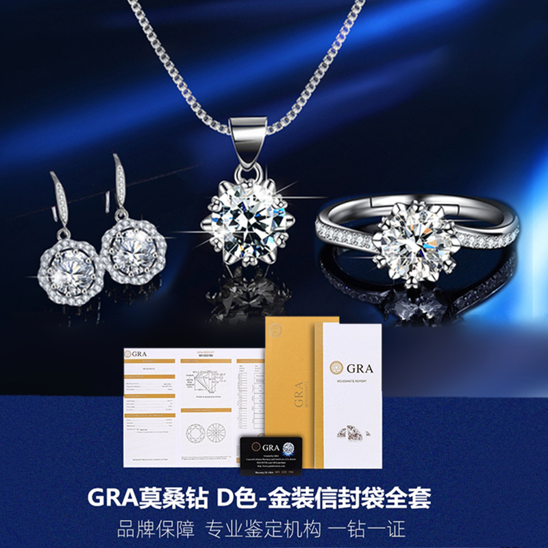 High-end foreign trade sterling silver female moissanite 1 karat three-piece combination set ring necklace pendant earring jewelry