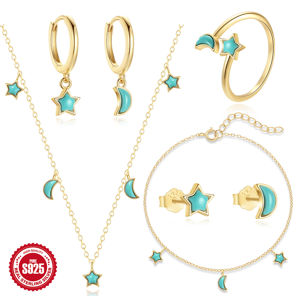 S925 Sterling Silver Star Moon Turquoise Necklace Bracelet Ring Earrings suit Europe and America Hot Selling Jewelry suit