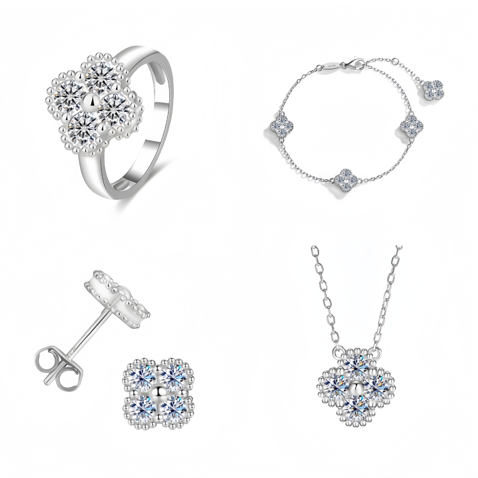 Cross-border exclusive for s925 sterling silver moissanite four-leaf clover pendant necklace bracelet earring ring suit live wholesale