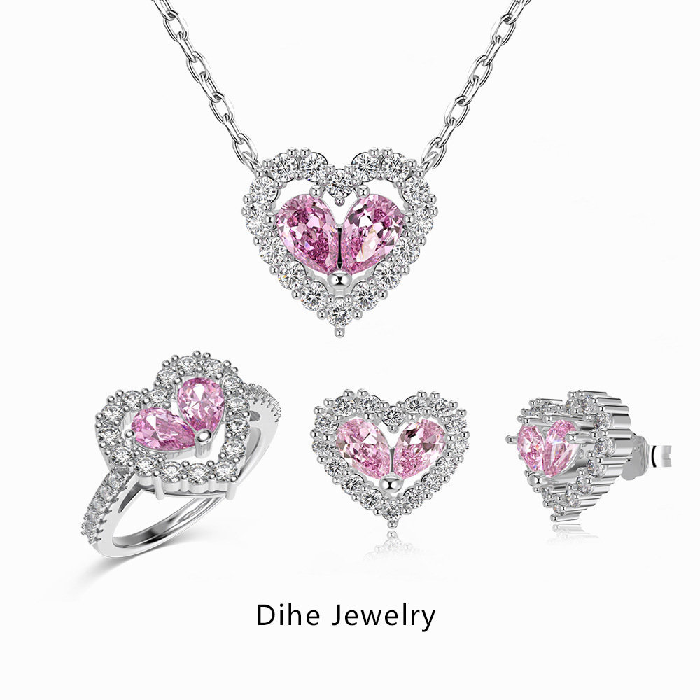 Live Explosions S925 Sterling Silver Earrings Ring Necklace Women's Love Hollow Powder Zirconium Inlay Exquisite Fashion Women's Suit