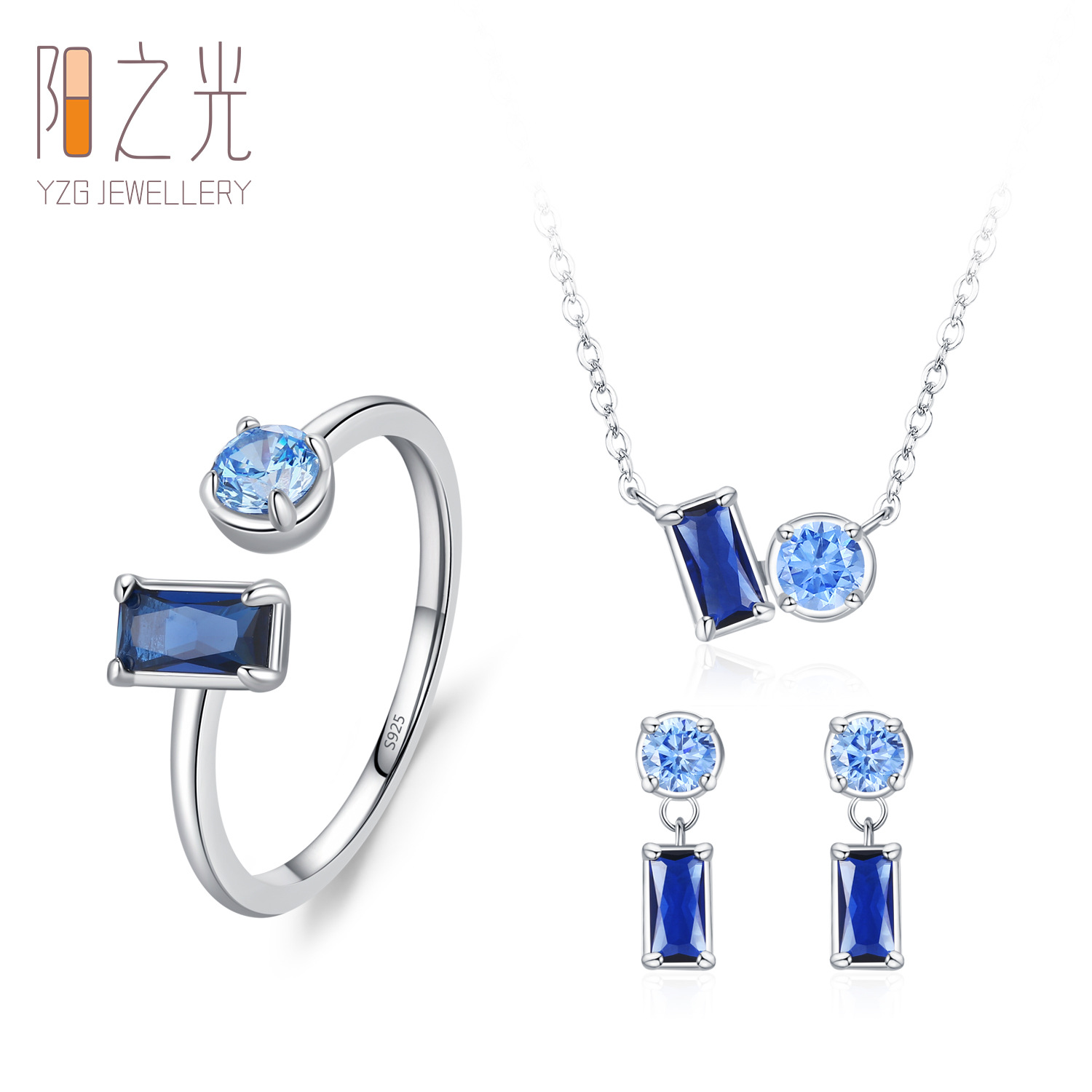 New S925 Sterling Silver Earrings Necklace Ring Three-Piece Set Elegant Elegant Fashion Sapphire Jewelry suit