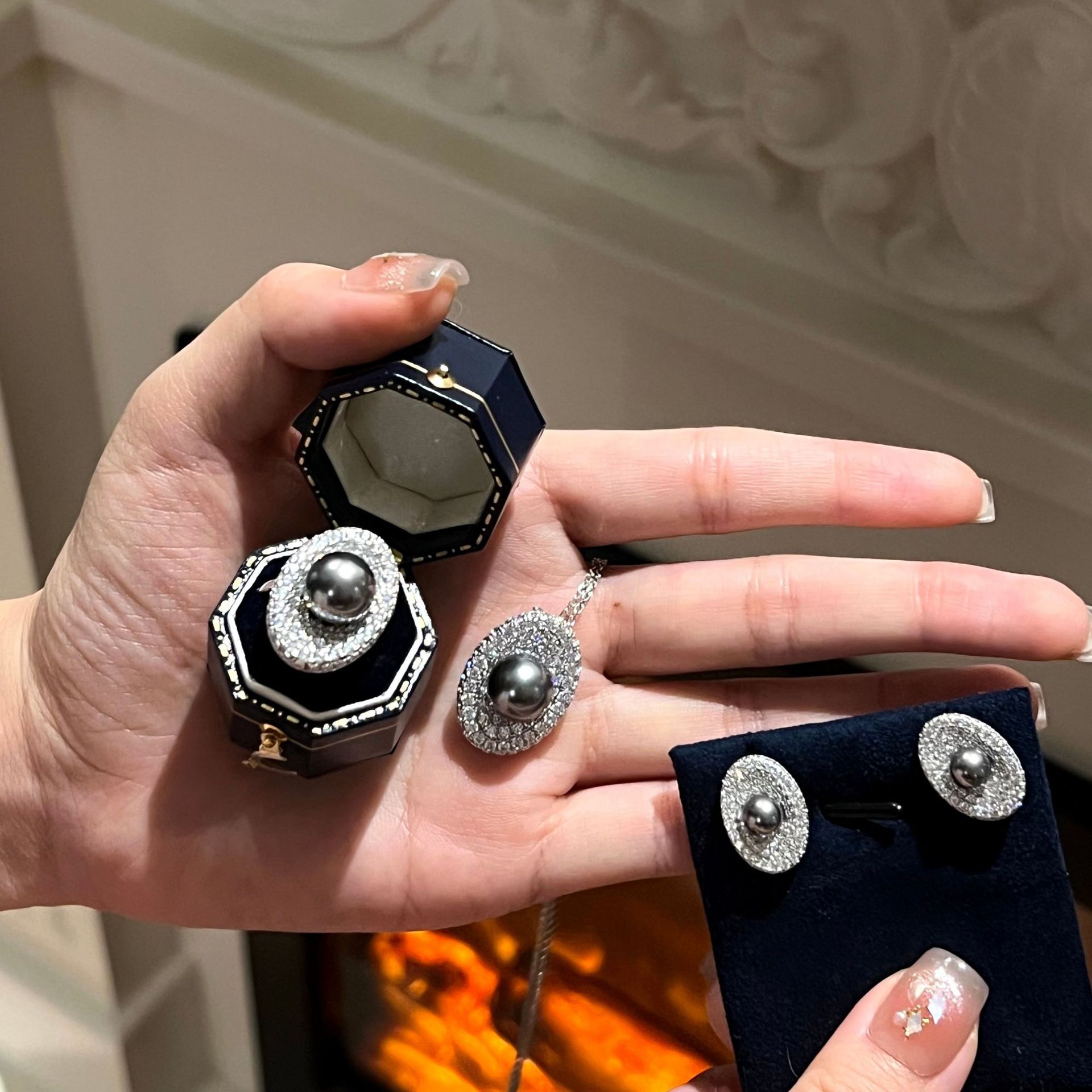 All-in-one S925 sterling silver tahidishijia Gray Pearl full diamond necklace ring earrings elegant female jewelry suit