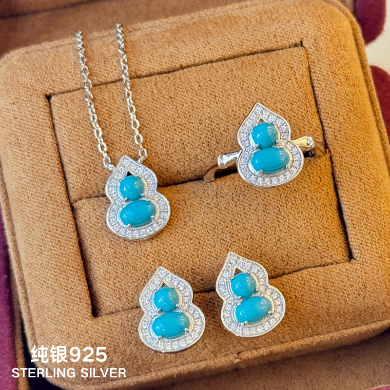 Sterling Silver S925 New Chinese Exquisite Micro-inlaid Turquoise Gourd Ring Earrings Necklace Niche suit White All-match