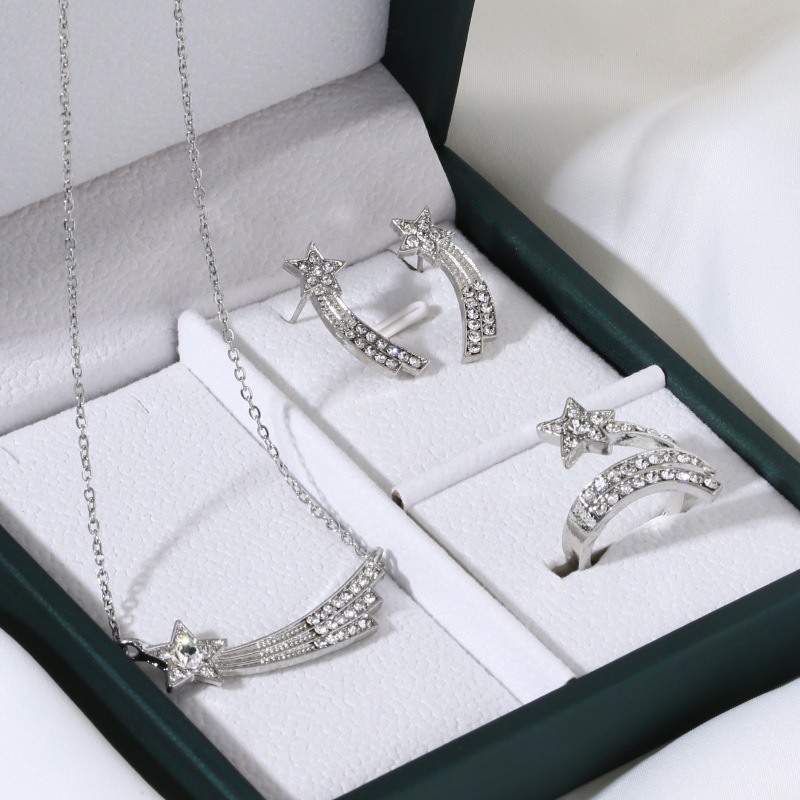 European and American Hot Selling Women's Star Moon S925 Sterling Silver Necklace Earrings Ring Cold Wind Fairy Three-piece Set
