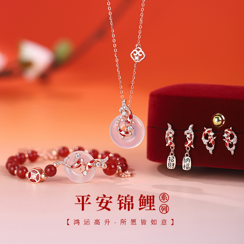 S925 Sterling Silver Fortune Koi Safety Buckle White Chalcedony Necklace for Women Niche New Chinese Style Internet Celebrity Hot Item Lucky Set