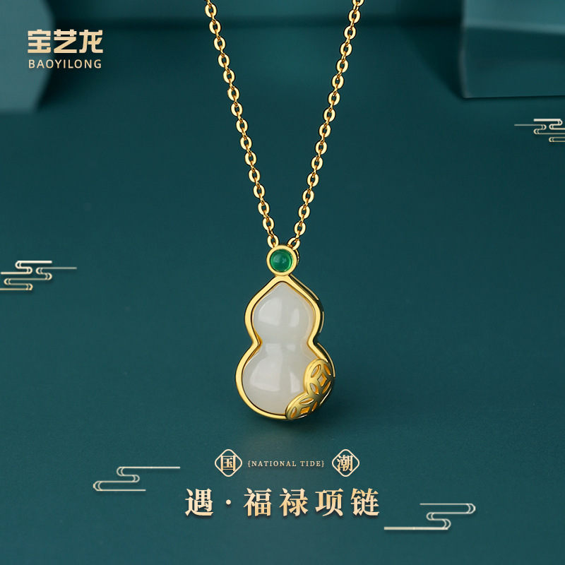 Yufulu Women's 925 Sterling Silver Necklace with a High-End Feel, Natural Chinese Style Hetian Jade Gourd Flower Pendant Necklace Jewelry