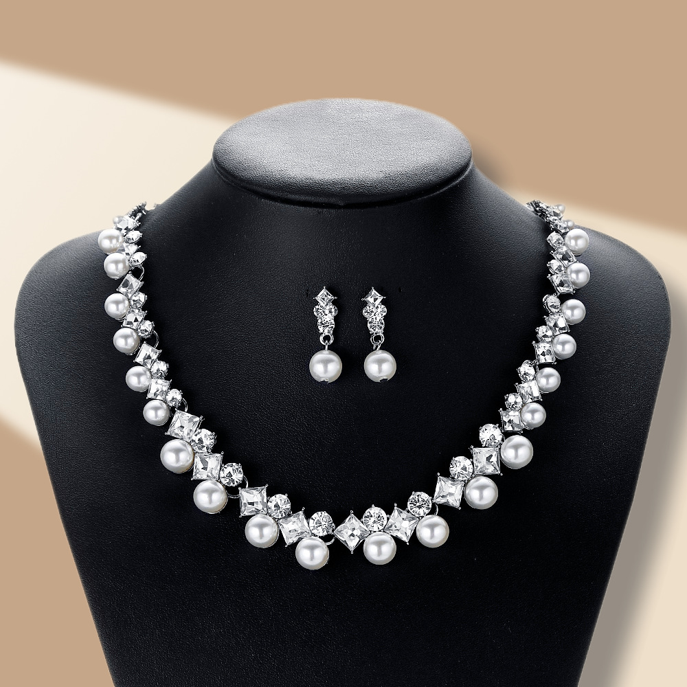 Pearl Necklace and Earring Set with Diamonds and Crystals, Bridal Wedding Dress Banquet Women's Jewelry, Light Luxury Style
