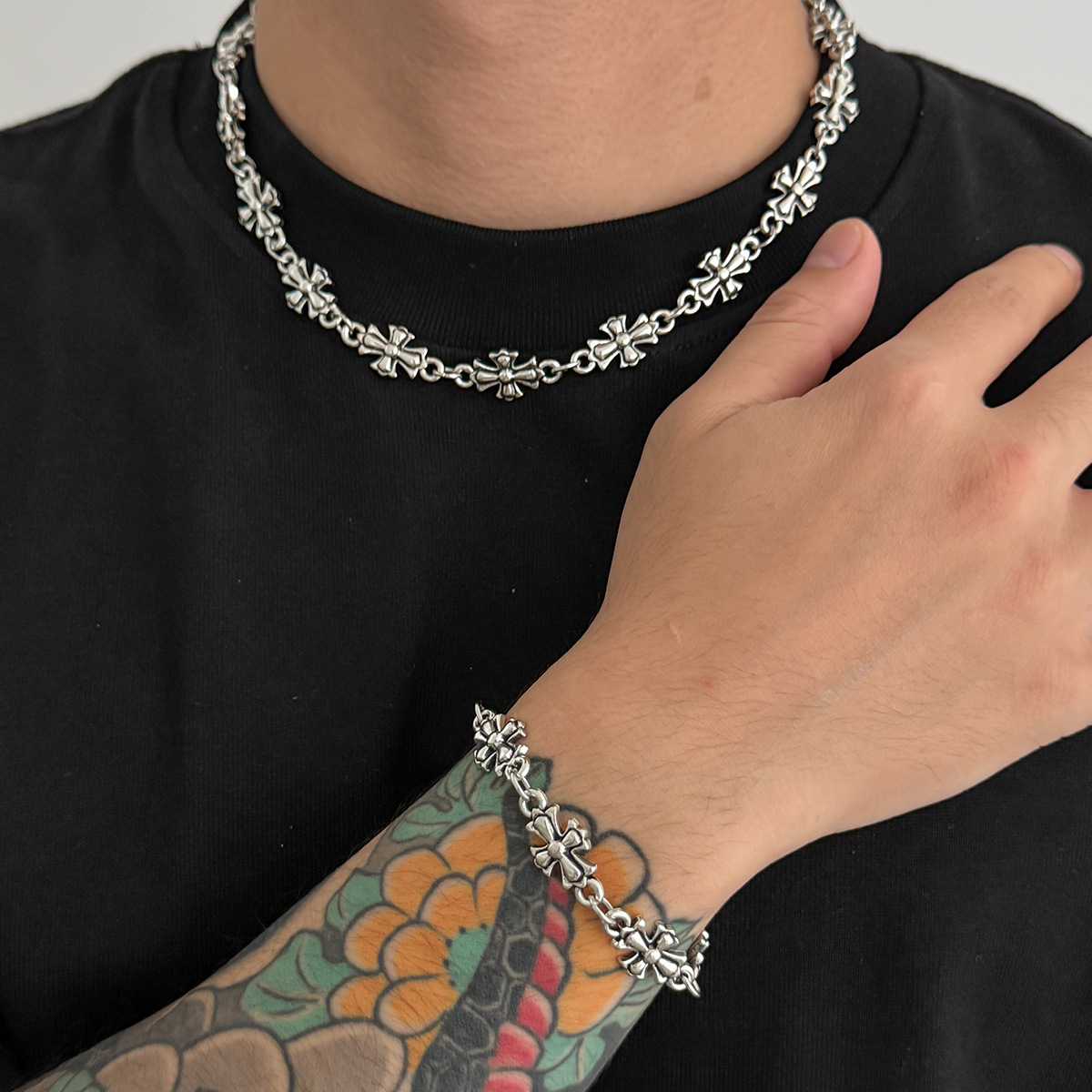 European and American Cross-Border Jewelry Men's New Cross Flower Alloy Necklace Bracelet Set Personalized Versatile Necklace Accessories
