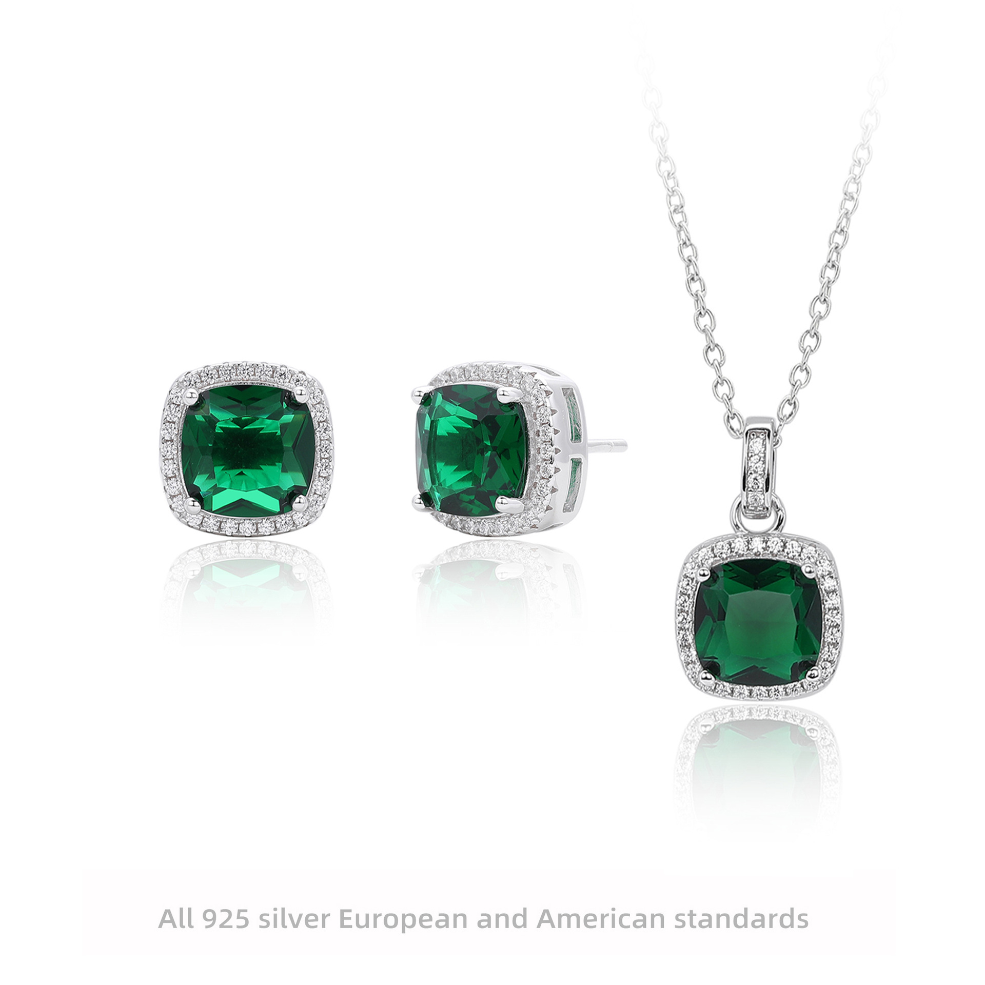 Cross-border new s925 sterling silver stud earrings necklace simulation emerald square fashion high-end simple two-piece in stock