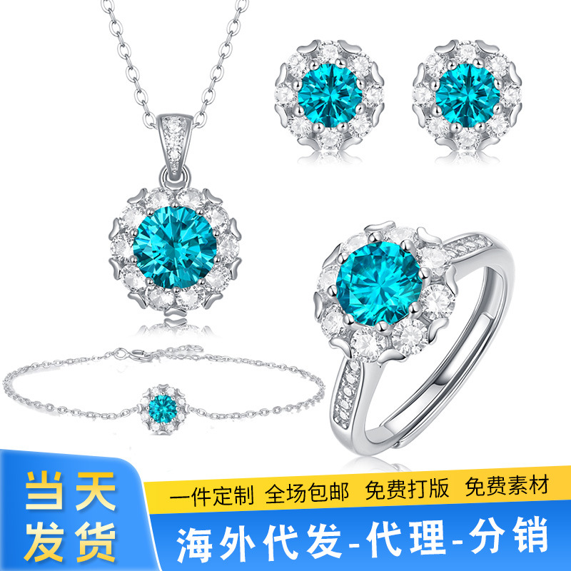 Japanese and Korean Moissanite Sterling Silver Earrings Bracelet Pendant Ring Electroplated White Gold Tiktok Live In-Stock Colored Moissanite Set
