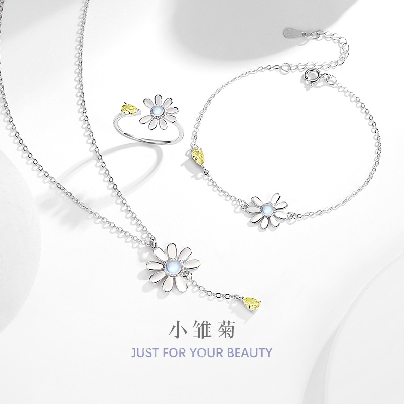Daisy Sterling Silver 925 Necklace Set Female Niche Design Entry Luxury Sunflower Bracelet ins Glazed Stone Ring